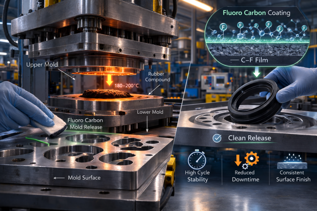 ในกระบวนการขึ้นรูปยาง โดยเฉพาะแบบ compression หรือ transfer molding ฟิล์มเคลือบต้องทนทั้งอุณหภูมิสูงและแรงกดจากแม่พิมพ์