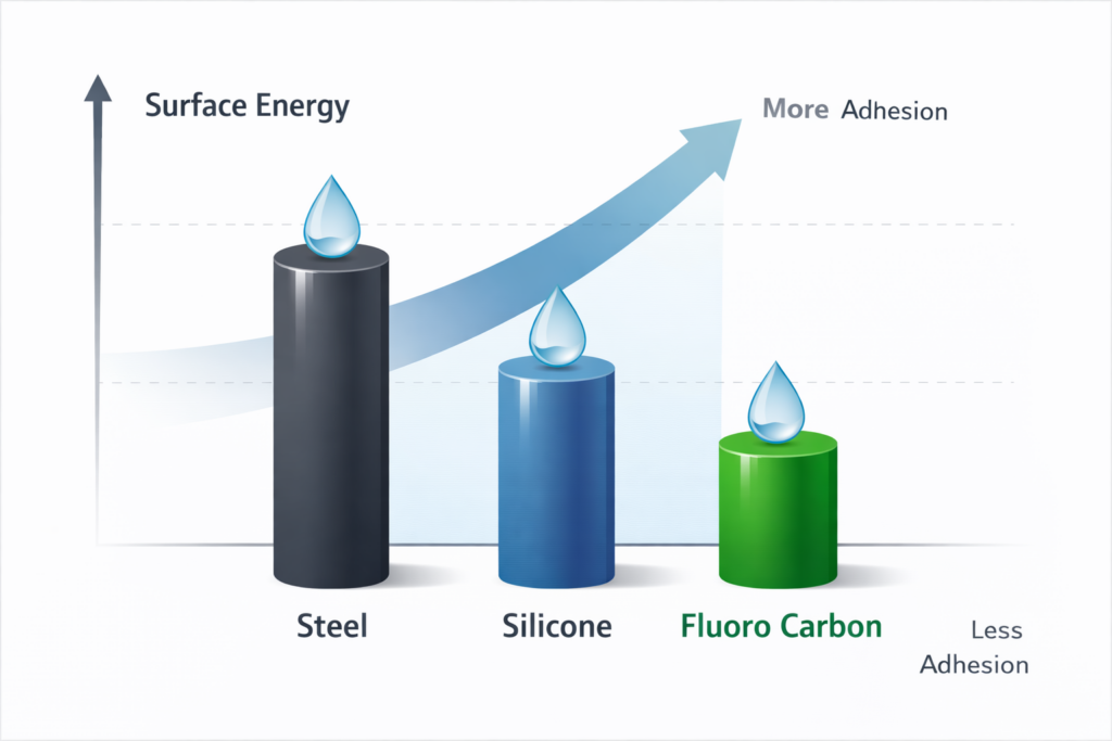 ในระดับการใช้งานจริง สมบัตินี้คือรากฐานของพฤติกรรม non-stick และแรงเสียดทานต่ำ ซึ่งเป็นเหตุผลสำคัญที่วัสดุกลุ่ม Fluoro Carbon ถูกนำมาใช้ในงานเคลือบผิวและระบบแม่พิมพ์